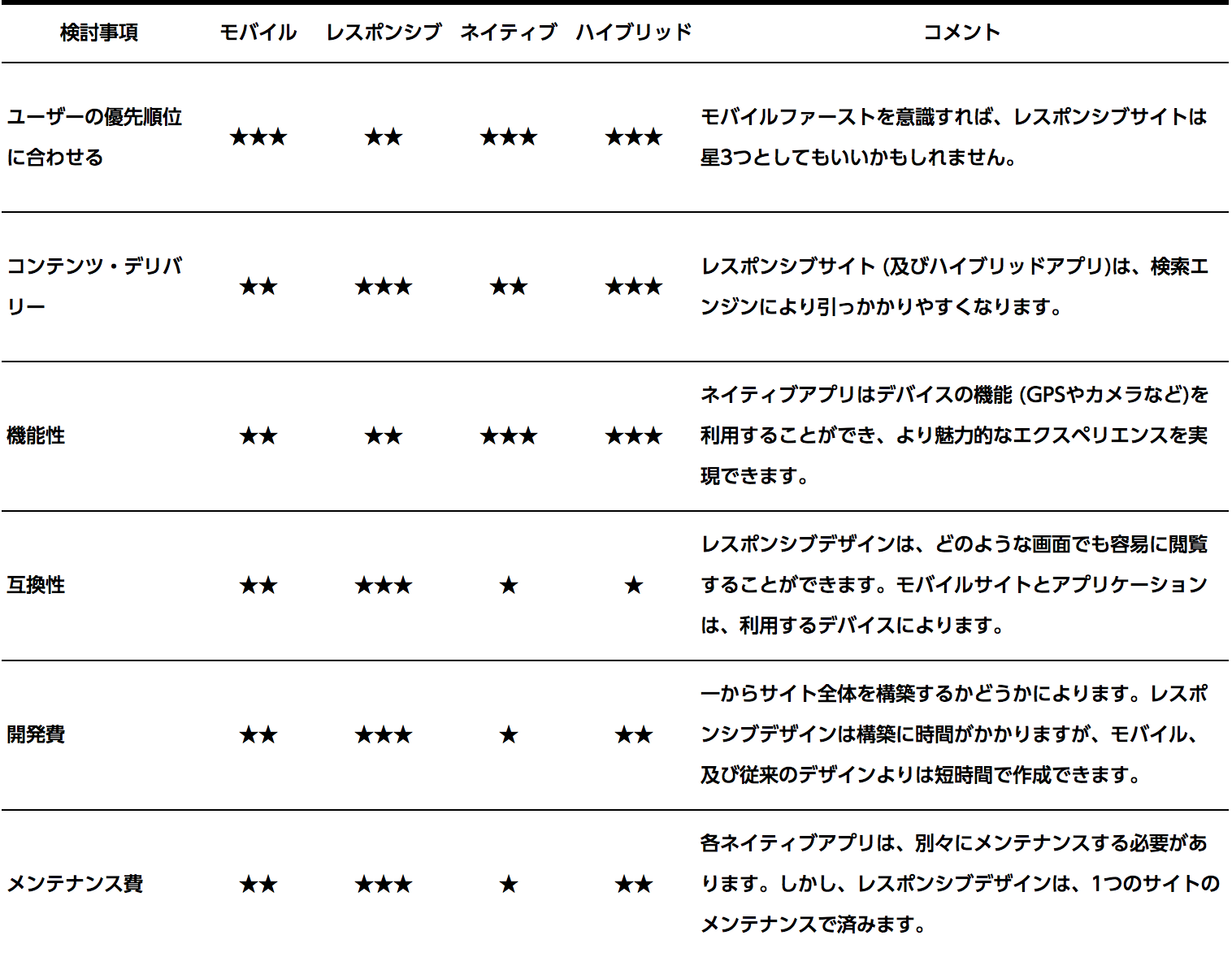 各デリバリー方法は、それぞれ異なる長所と短所を持っています。自分のデザインコンテキストをもとに、適したものを選びましょう (以下の表では、星の数が多いほど良いです)。