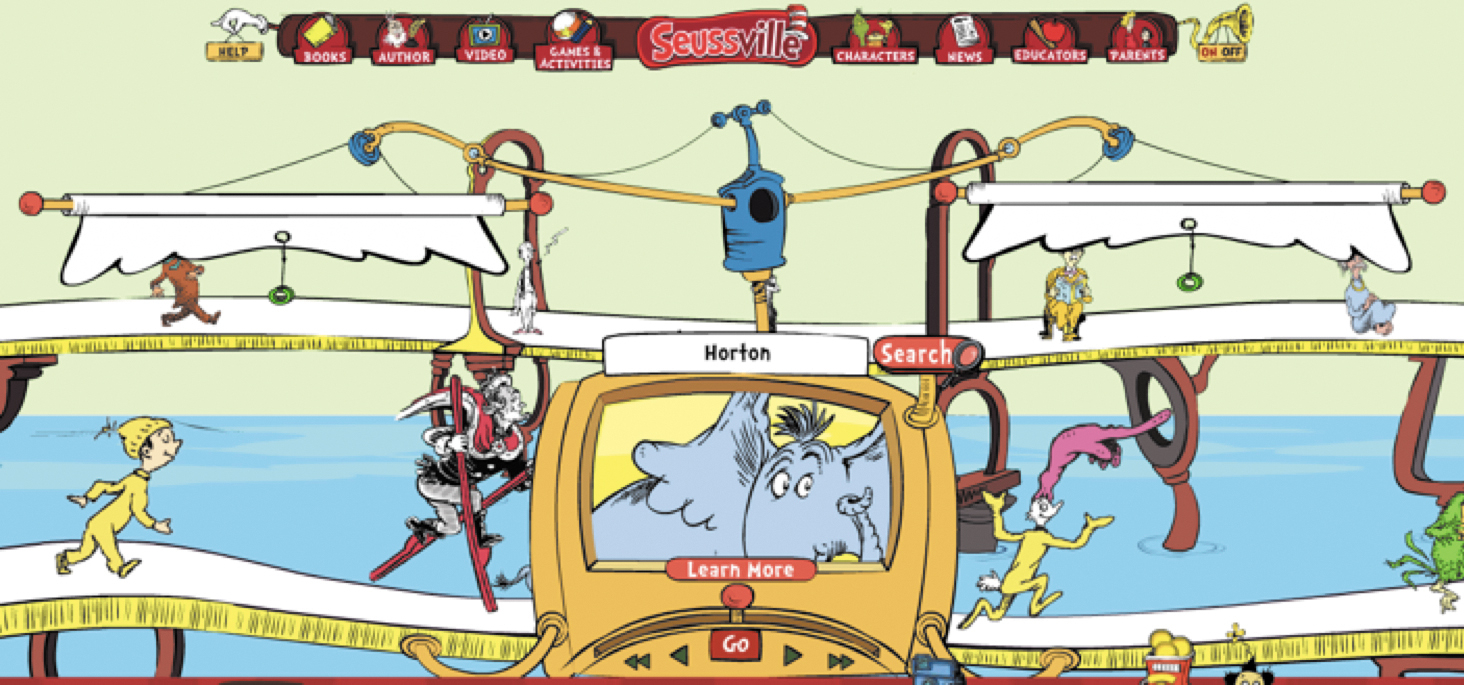 この社交体験は、Seussvilleのサイトのほとんどのゲームで取り入れられています。例えば、ユーザーが「Horton the elephant」のアクティビティリストの中から「Horton Hears a Tune」というゲームを選択した場合、ユーザーは Hortonのサポートのもと、オルガンのような素敵な楽器を使って自分オリジナルのメロディーを作ることができます。その後、実在する人間とのコミュニケーションとして、ユーザーは自分の曲を保存し、家族や友人とシェアすることができます。