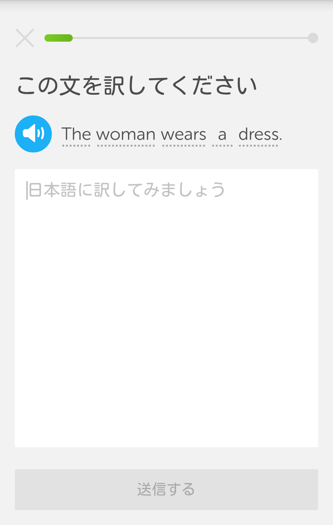 duolingoの「衣類」ステージの問題の一例。これは日本語訳問題。
