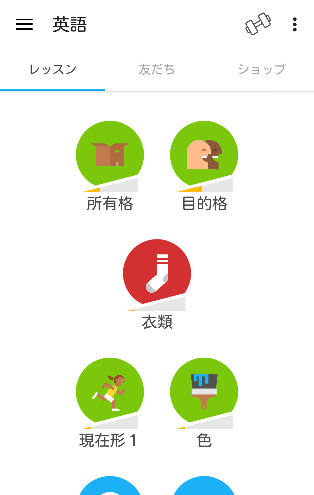 duolingoのステージ選択画面。タイトルに沿った問題が出される。