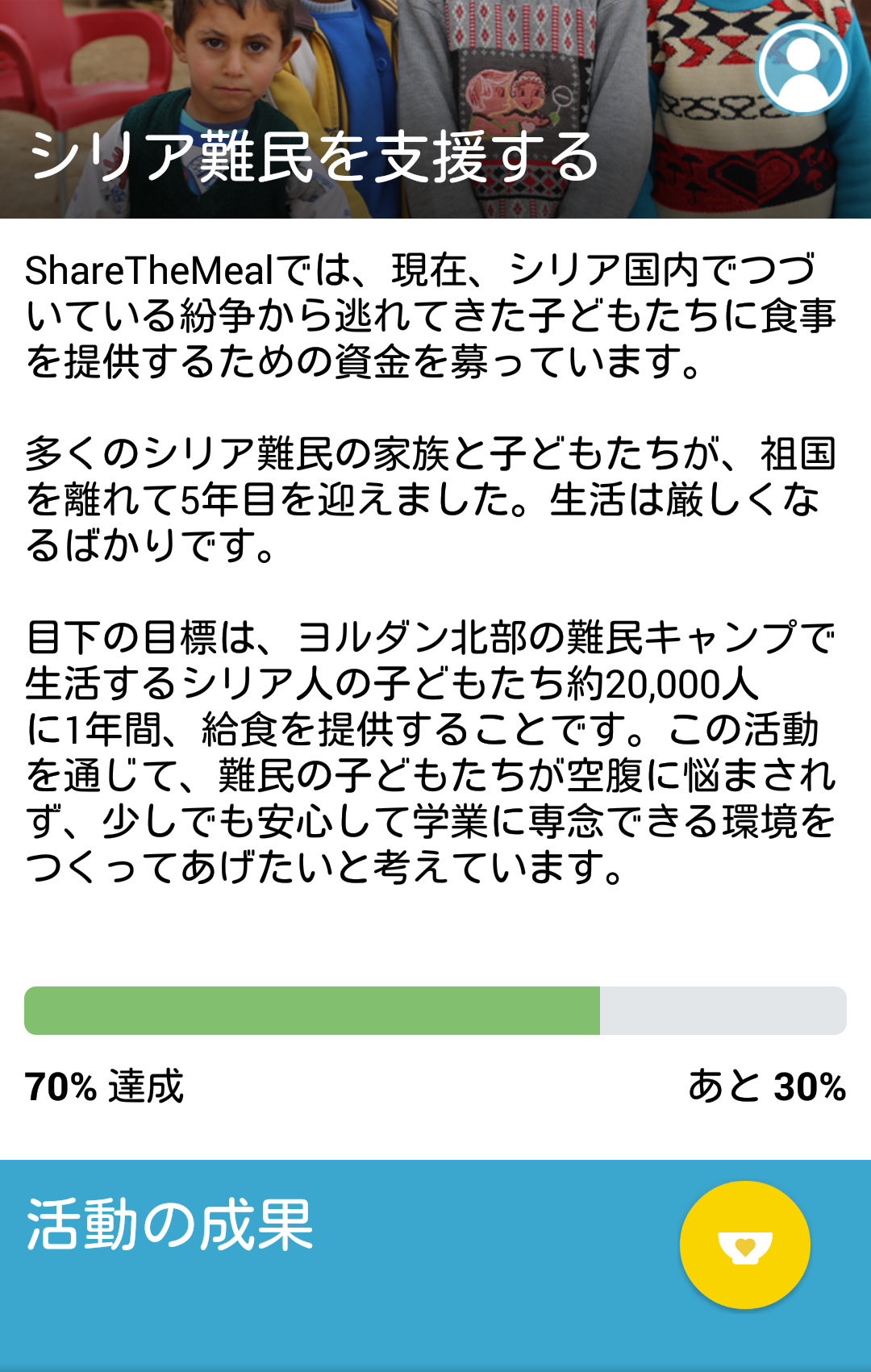 世界の8億500万人が慢性的な栄養不足に陥っています。全体数は徐々に減少していますが、未だに多くの人が飢餓に苦しんでいます。今回紹介するShareTheMealは、国連に所属し食糧支援を中心に活動する機関であるWFPからリリースされている、世界初の飢餓撲滅のための寄付アプリです。現在は、シリア内の紛争から逃れヨルダンの難民キャンプで生活する2万人の子どもたちへの食事支援プロジェクトが実施されています。