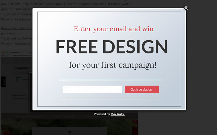 電話マーケティングやテレビ広告を経験した人なら誰でも知っているように、インタラプションマーケティングは役に立つものです。ユーザーが行っていることを中断させて、表示されるメッセージに対応させます。これはモーダルの場合に特に当てはまります。なぜなら、ポップアップが表示されると、Webページをブラウズし続けるにはメッセージに対してなんらかのアクションをする必要があるからです。これは単に「閉じる」をクリックするだけでもです。