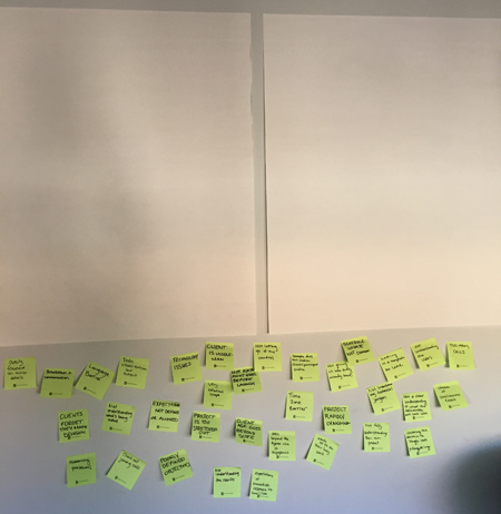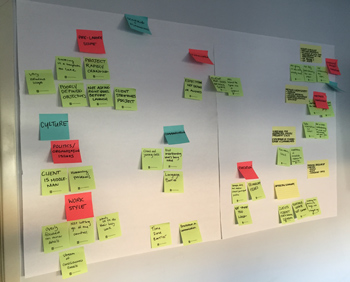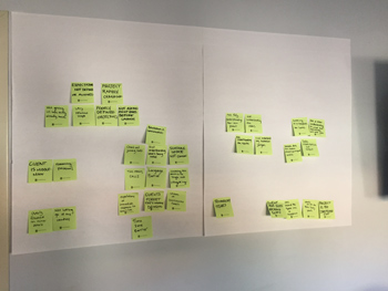 親和図法を活用した作業は、出されるメモの数に応じて数分で終わるものから数日間を要するものまでさまざまです。私たちが今回行ったケースでは、2時間かかりました。