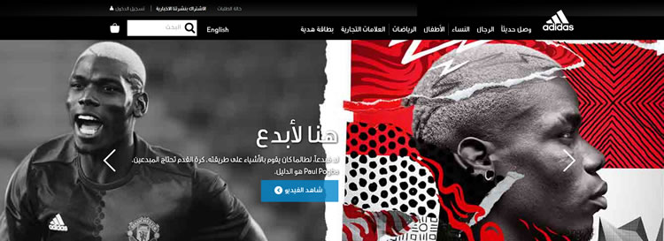 このアディダスのサイトでは、(通常は左上の角にある)ロゴを右上の角へと移動し、ウェブサイト全体のレイアウトを変えています。そう、テキストだけでなくレイアウトも変更しているのです。例えばアラビア語でウェブサイトを提供するなら、画像、サイドバー、ナビゲーション、コールトゥアクション(CTA)、ドロップダウン、スクロールバー、そしてボタンなどすべてを調整する必要があります。