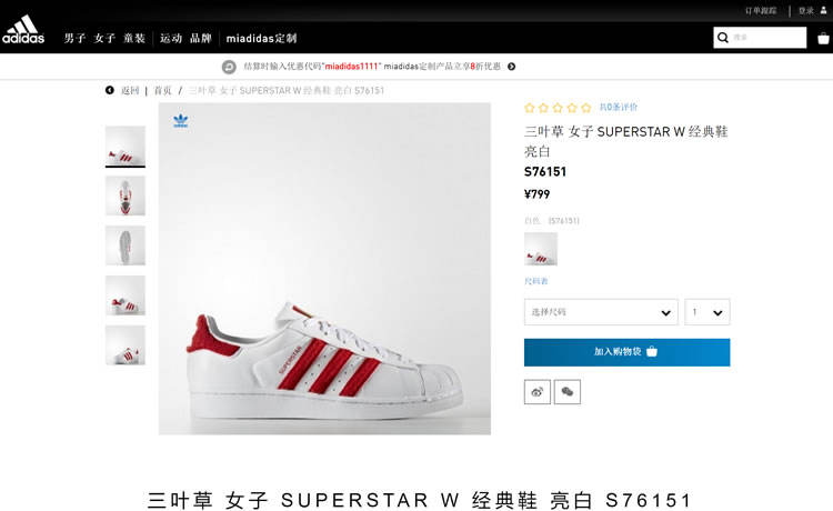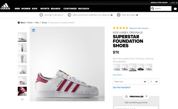 ウェブデザインにおける重要なコンセプトを活用するため、アディダスのロゴにはsans-serifフォントが使われており、サイトの英語版のテキストにも使われています。それがブランドアイデンティティなのです。いかにして言語の変更がこのようなブランドアイデンティティを損ねてしまうか気づくことでしょう。