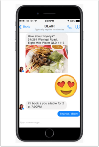Blairはシンガポールで作られた音声統合チャットボットで、Facebook Messenger上でレストランの推薦および予約ができます。Blairは、パーソナライズされたオンライン予約サイト「OpenTable」のようなものであり、今後レストランだけでなくワインバーやデザート店などの飲食サービスと提携できる可能性を秘めています。