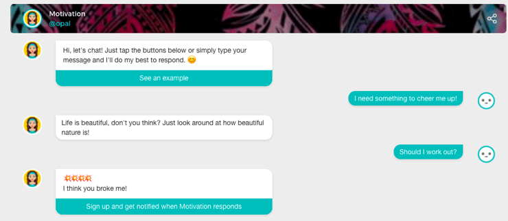私はこのタイプのボットの試作品、BOTTRのOpalを試してみました。Opalはユーザーがクリック可能な応答をあらかじめ用意してあり、それをクリックするとOpalが返事をくれます。もし私が「元気がない」と送ったとしたら、Opalは元気づけるメッセージを返すでしょう。しかし、Opalは単純な判断しかできず、元気づけることができるだけで、私に仕事のモチベーションを起こさせることはできませんでした。