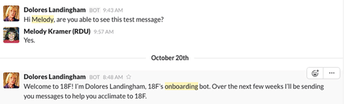 Dolores Landinghamは、18F(編注:アメリカ共通役務庁付けのデザインオフィス)のSlackにおける社員向けのオンボーディングボットです。このボットはWest Wingのキャラクターにちなんで名づけられ、異なる時間帯にいるユーザーをサポートできるように作られています。ユーザーは「利益管理」か「法務担当」か選ぶことができるので、情報過多で手間取ることはないでしょう。Doloresがいれば、新しい仕事を始める際に、社員は何時間も対面トレーニングをしたり、山のような書類手続きをしたりする必要がなくなります。