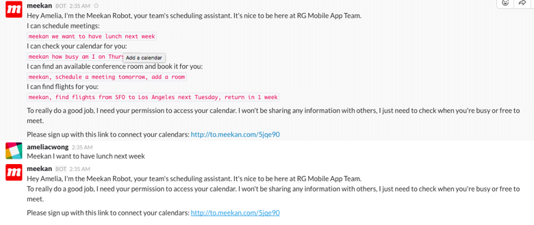 一例としてMeekanが挙げられます。Meekanはランチのスケジュールを立て、カレンダーを確認し、会議室の予約をし、飛行機を探すことができます。Slackや画面上でのMeekanは理想的な助手のようにみえます。