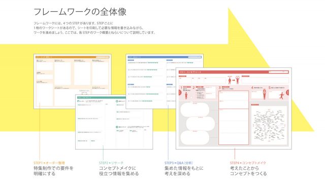 特集ページの制作に特化した「オーダー整理」「リサーチ」「Q&A(分析)」「コンセプトメイク」という4つのステップでシートが用意されていて、質問に答えていくことで発散、収束できるように構成されています。UXデザインをやっている方なら、こんな課題があって、その解決のためにこういう手段がある、というのがわかると思うのですが、そもそもどういった切り口でやればいいかわからない方向けにQ&A形式にして答えが導き出せるような作りになっています。