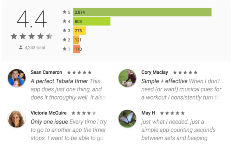 My Tabataはデザインだけを見ると、かなり微妙なアプリと思われるかもしれません。しかし、アプリを設計されたコンテキストに沿って使用すると、ある問題を非常に上手く解決していることがわかり、良い印象に変わるでしょう。その結果、My Tabataは4200人以上のユーザーから平均レビュー4.4 / 5を獲得しました。