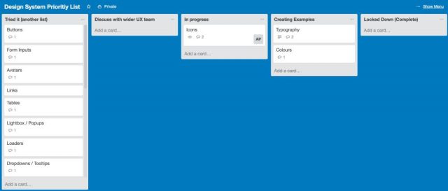 デザインチームと開発チームが密接に連携し、先程のUIの調査に基づく優先順位を作りましょう。そうすることで、近い将来のロードマップを描くことができるでしょう。Trelloは優先順位のリストを最新の状態に保つのに良い方法です。