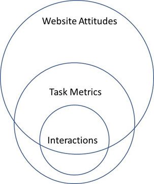 図1は2つのことを示しています。第一に、Webサイト全体への態度とユーザーが行うタスクの指標には強い相関があることです。第二に、Webサイトへの態度は、ブランディングやこれまでの経験などの、タスクを行う体験とは異なる変数の影響を受けます。