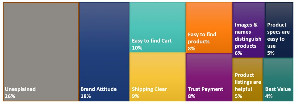 26%を占める「原因不明」は、9項目では説明されていない側面と、データを集める際に避けられない変動性や測定誤差を反映しています。しかし、わずか9項目で要因の74%を説明できたことは、行動科学において優れた結果です。また、SUPR-Qの8項目から、ネット購買体験の効果を突き止められることも示しています。