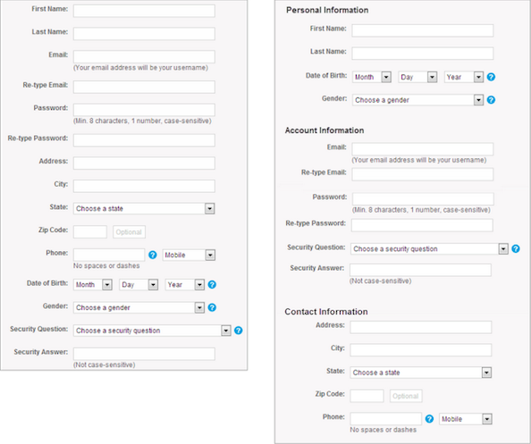 情報を適切なグループに分けると、閲覧しやすかったり、見やすくなったりします。下の2つのフォームを見てください。右側のフォームでは、15個の項目を3つのグループに分類し、プロセスをより簡単にしています。コンテンツの量は同じですが、ユーザーへの印象は大きく異なります。
