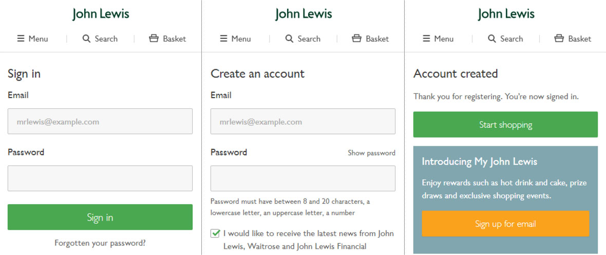 UseltBetterによる調査によると、ヨーロッパの上位40社のECサイトが使用している典型的なモバイル登録フォームのフィールドとCTAの数は大きく異なるようです。 たとえば、burton.co.ukやjohnlewis.comといったサイトは、シンプルな体験を提供します。 ユーザーが記入するフィールドは、メールアドレス、パスワード、パスワード確認、週刊のニュースレターへの登録、登録ボタンの5つだけです。