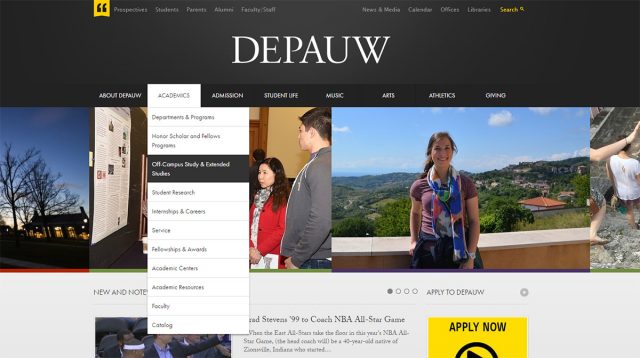 DePauw Universityのサイトでは、白と黒というシンプルな対照色を使っています。デフォルトのナビゲーションでは、黒の背景色に白のテキストを使用しています。そしてリンクがホバーされると、その色が反対になります。
