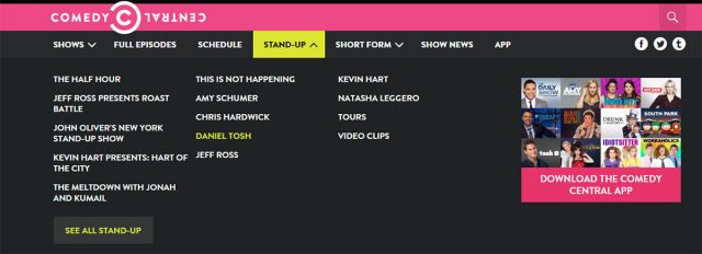 Comedy CentralのWebサイトでも同様の効果を使っています。白を使った強調の代わりに、ここでは黄色とライムグリーンのコントラストが使われています。
