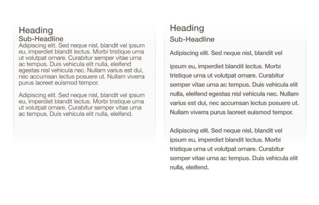Dmitry Fadeyev氏が指摘したほうに、パラグラフの間の空白を適切に設定すると20%理解度が向上します。空白を広く取ると、ユーザーが呑み込みやすい量のコンテンツを提供することになり、結果的に余計な詳細情報を取り除くことができます。