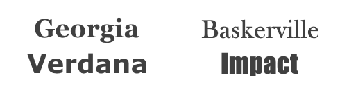 一般的には、フォントの数は最低限に抑え、全体を通して同じフォントを使用しましょう。フォントは、大抵の場合1つで十分であり、2つでも多い方です。もし2つ以上のフォントを使う場合は、文字の太さを基に、お互いを引き立たせるものにしましょう。以下は、フォントの組み合わせの例です。左の GeorgiaとVerdanaの組み合わせは、文字の太さが似ており、調和が取れています。 一方で、右のBaskervilleとImpactの組み合わせは、Impactの太さでもう片方のセリフ体が見劣りしてしまっています。