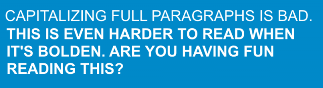 頭文字やロゴなど、「読む」作業が関係しない場合では、すべて大文字のテキストでも問題はありません。しかし、読んでほしいメッセージの場合は、ユーザーにすべて大文字のテキストを読ませるのはやめましょう。Miles Tinker氏の傑作『Legibility of Print』にあるように、すべて大文字のテキストは小文字のと比べると目を通したり読んだりするスピードが格段に遅くなります。
