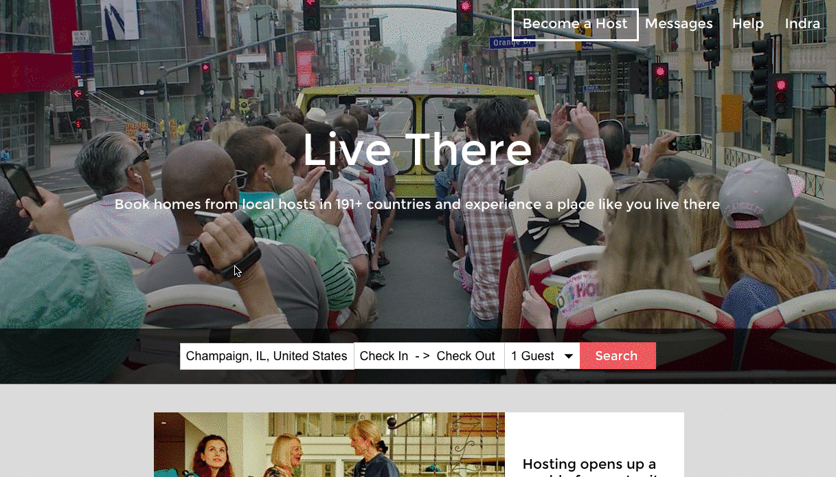 ヘッダー全体が、Airbnbの旅行者が体験した、世界中のさまざまな文化や環境の動画になっています。これは、人々が旅行のWebサイトで見たいと思うものです。ユーザーは簡素なテキストフォームを入力したり、予約をしたりしたいのではありません。旅行を計画する間でも、旅行をしたいと思うのです。