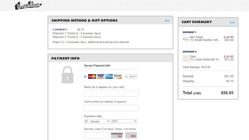 また、必要な箇所でビジュアルを示すアイコンをたくさん追加してください。Threadlessチェックアウトページは素晴らしい例です。