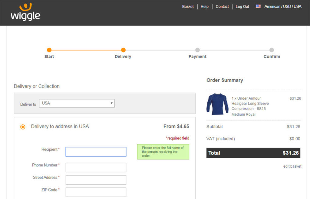 パンくずリストの効果は大きいので、特に長い支払いフォームには追加することをおすすめします。 Wiggleのチェックアウトでは、各フォームページの上部に明確なパンくずリストが使用されています。
