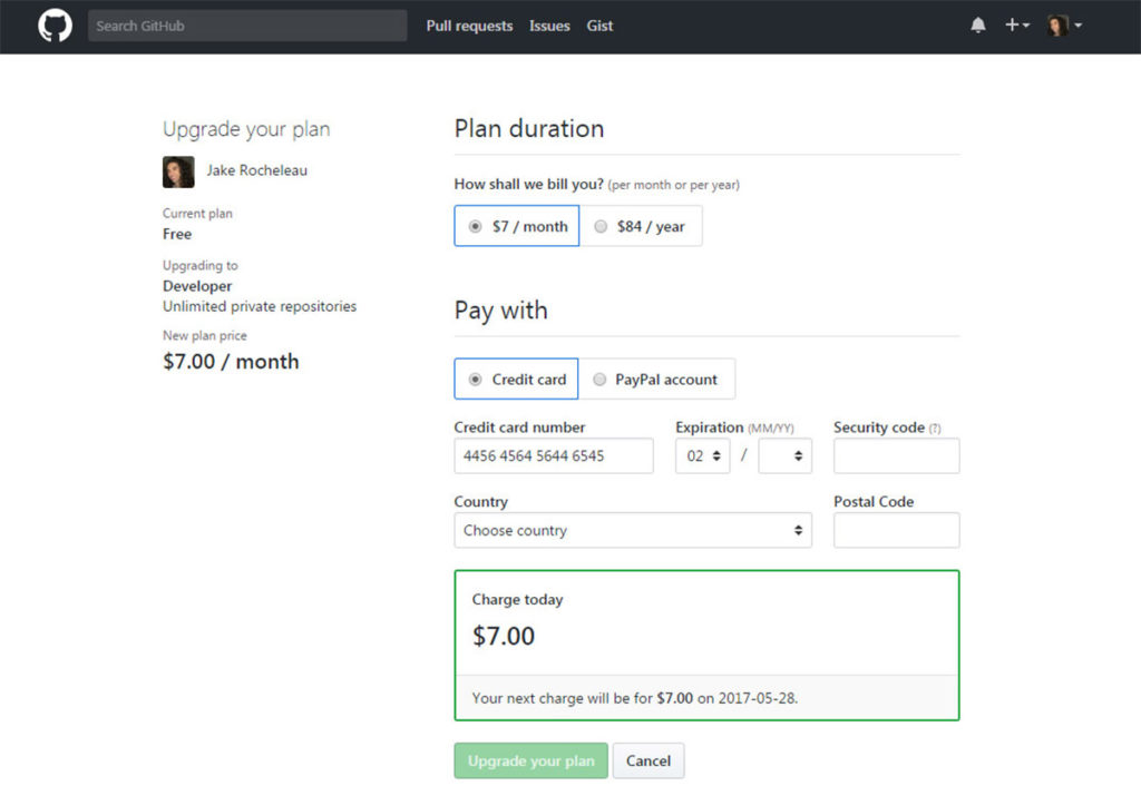 GitHubの有料アップグレードでは、購入のすべてを1ページに要約しています。どのくらいの頻度で請求されるのか、最終的な料金はいくらか、そして次の料金がいつわかるかを明確にします。ほとんどのフィールドは個人のプロフィールから記入されるので、アカウントを持っている場合このプロセスは非常に迅速です。