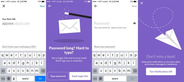 ログイン画面に入る選択をして、既存のチームにアクセスすることを選ぶと、見やすくて洗練された画面がユーザーを迎え入れます。画面上にはユーザーのSlackのURLを開くための入力欄が1つ表示されています。Slackのアプリはさらに、マジックリンクも提供しています。これによってユーザーは、モバイル用にパスワードを記憶する手間が無くなります。