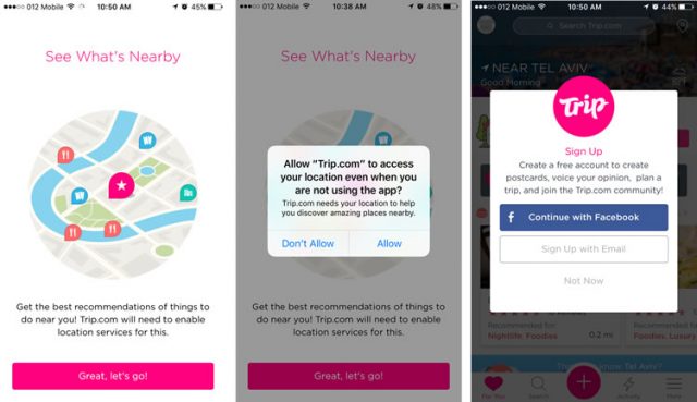 最後にもう1つ重要なこととして、Trip.comはアカウントを作成したいかどうかを尋ねます。ポップアップによって、アカウント作成をする利点を簡潔に説明します。ここでは登録をする2つの方法が提供されます。しかしもっとも重要なのは、アプリの価値を実感できているオンボーディングの最終段階で尋ねていること、そして、登録するタスクを強制しないことです。質の高い、配慮の行き届いたオンボーディングを通じて、Trip.comは現代のモバイルアプリユーザーの純粋な認識と、彼らのニーズを実装しています。