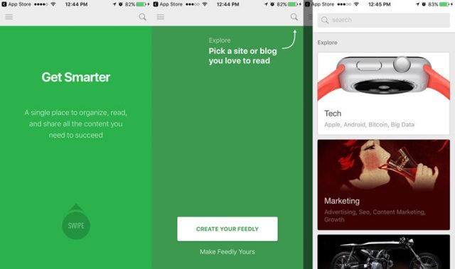 Feedlyのユーザーオンボーディングは、従来的なスライドによるチュートリアルとは違うやり方をしています。一連のスライド表示をする代わりに、Feedlyは前進的なユーザーオンボーディングを通して「ユーザーが体験する中で学べる」ようにしています。