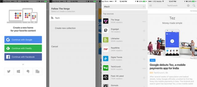 また、オーバーレイのレイアウトによって、操作する際にどんなスワイプを使えばいいのか簡単に理解できます。フォローしたい関連出版物と合わせて興味のあるカテゴリーを選択すると、アカウント作成について知らせるオーバーレイが表示されます。これはFeedlyの優れた戦略です。コンテンツを保存することと、アカウントを作成することが、直接的に繋がっています。アカウントの作成方法についてもたくさんの選択肢があるので、さらに印象的です。