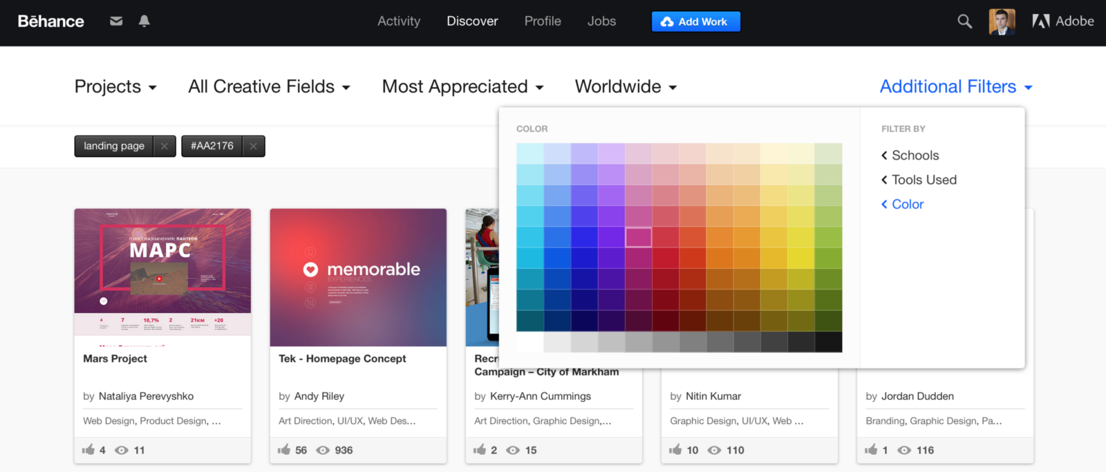 Behanceでは、さまざまな業界で活躍するプロのクリエイターが作ったオンラインポートフォリオから最新の作品を閲覧、検索できます。これらは素晴らしいインスピレーションの源です。色の条件を指定して、興味深いく創造的な新しい作品を見つけましょう。