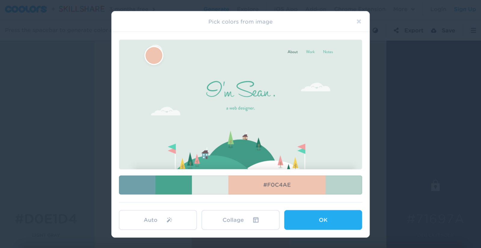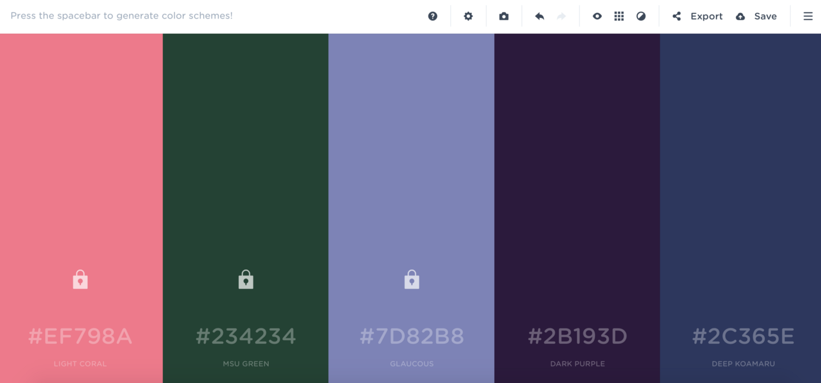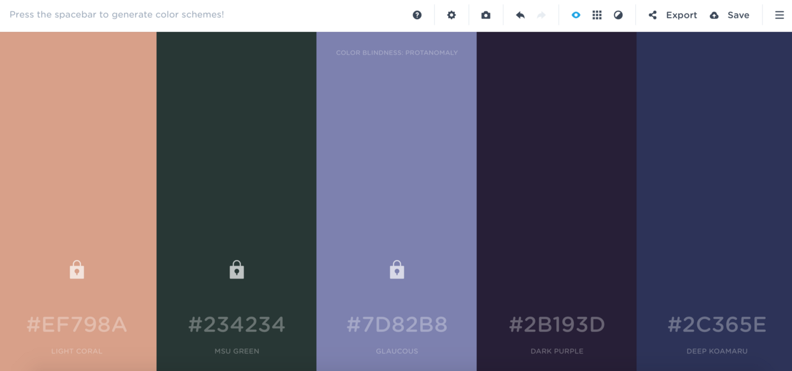 Coolorsは、複数の色でカラースキームを作成する強力なツールです。選択した色をロックしてスペースキーを押すだけで、新しいパレットを生成することができます。このツールの優れたところは、1つの結果だけに限定されず、基準点を変更するだけで、いくつかの色の配色パターンを受け取ることができるところです。