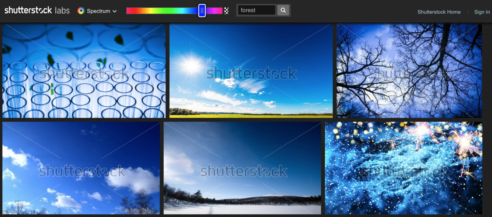 カラースキームが適切か判断する最善の方法のひとつは、ストックされたイメージから選ぶことかもしれません。主なストック画像サービスはこの種のツールを提供していますが、なかでもShutterstock Spectrumは大きなプレビュー画像など、素晴らしいインターフェイスを備えています。パレットを生成するにはプレビュー画像を透かすだけで十分なので、お金を払う必要もありません。