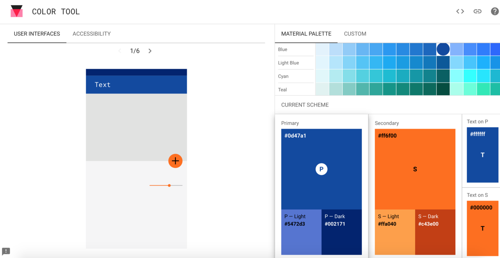 Material Design Color Toolでは、カラーパレットを作成、共有、UIに適用したり、指定した色の組み合わせのアクセシビリティを確認することができます。