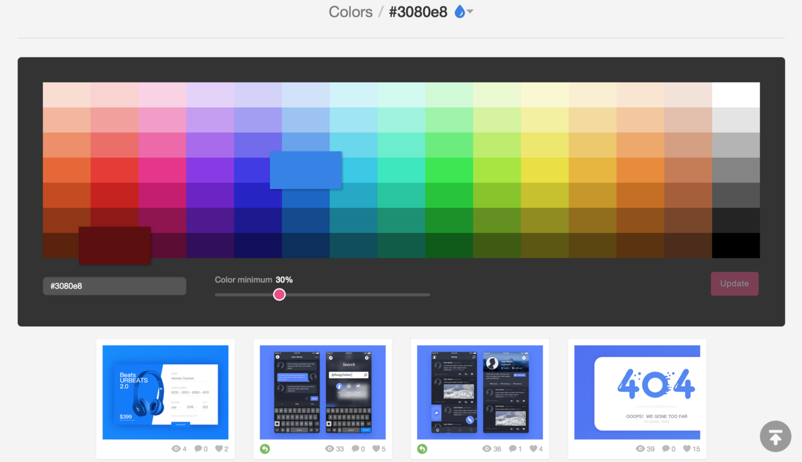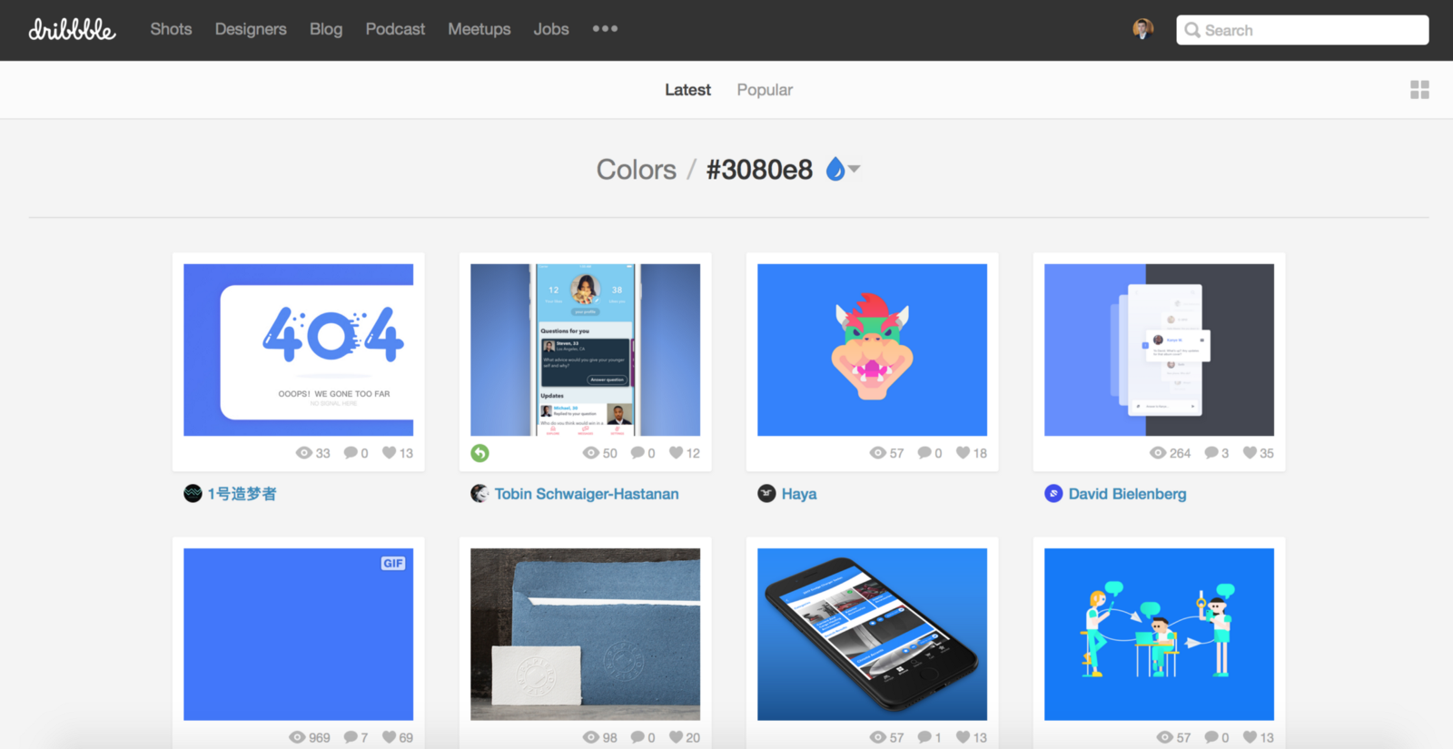 Dribbbleもまた、UIのインスピレーションを受けるのに最適なツールの1つです。Dribbbleには色で検索するツールがあります。ほかのデザイナーが特定の色をどのように使用したかを視覚的に調べたいときには、dribbble.com/colorsで希望の色を選択しましょう。