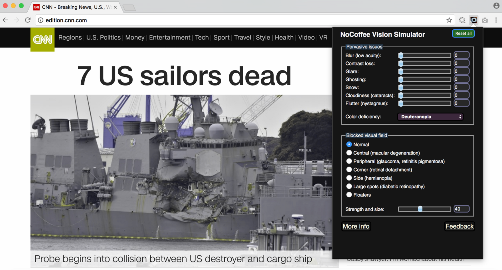 NoCoffee Vision Simulatorを使用すると、Chromeで表示できるすべてのページで色覚障害や低視力状態の見え方をシミュレーションできます。たとえば、「色彩不足」に設定して「色彩異常」にすると、Webページをグレースケールで表示できます。