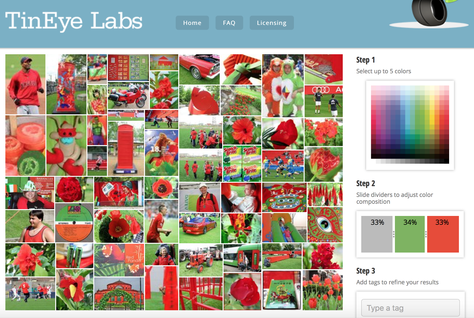 Tineyeは、写真の配色を調べるのに役立ちます。また、それぞれの色の比率を指定することもできます。このWebサイトは、Flickr内の2000万ものCreative Commonsのデータベースを使用しています。これはおそらく、優れた配色のフリー画像を取得する最速の方法でしょう。