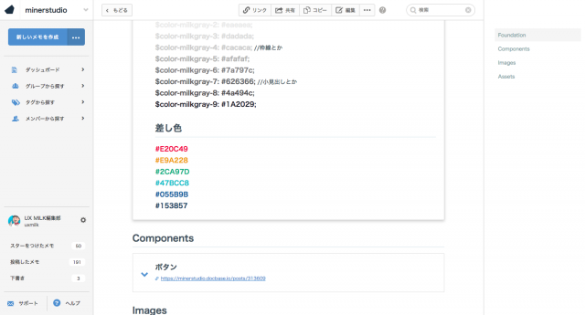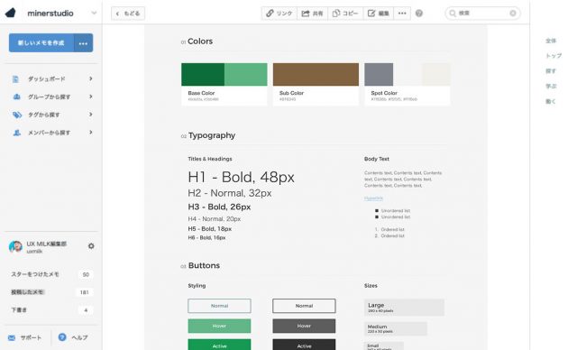 UX MILKチームでは、デザインについてのルールをメモとして断片的にDocBaseに投稿しています。たとえば、ボタンやタイポグラフィのように項目毎にメモを作成し、あとから「まとめ機能」を使うことで1つのドキュメントに集約しています。