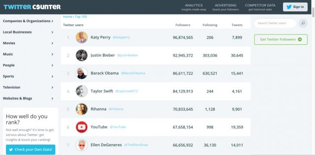 Twitter CounterのWebページでは、フォロワー数に応じたTwitterユーザー全員のリーダーボードが見られます。これはTwitterが提供する無料ツールの一部で、さらに個人や企業のリーチ数を増やす課金ツールもあります。Justin Bieber氏は、1位のKaty Perry氏を追い抜くことで頭がいっぱいなわけではありませんが、リーダーボードには一般的に、製品やサービスの使用頻度を促進する効果があります。