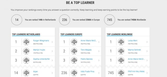 Interaction Design Foundationのオンライン講座では、リーダーボードを使用しています。これにより、受講者が自分の国や世界のグループと自分自身を比較することを奨励しています。