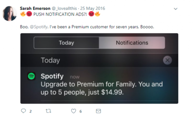 - ユーザーが使用できない情報をプッシュしてはいけません。成功するプッシュ通知は、常にユーザーにとって使い勝手が良いものです。下のSpotifyの例のように、もしユーザーの助けにならないメッセージなのであれば、悪いプッシュ通知を送信していることになります。