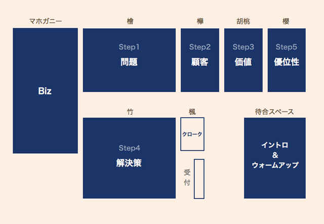 リーンキャンバスの各項目を埋めるためにそれぞれの項目の部屋に移動してワークをします。それぞれの部屋にスタッフが配置され簡単なファシリテートをします。(が、基本的には皆さんがファシリテーターくらいの勢いで取り組んでいただきます)