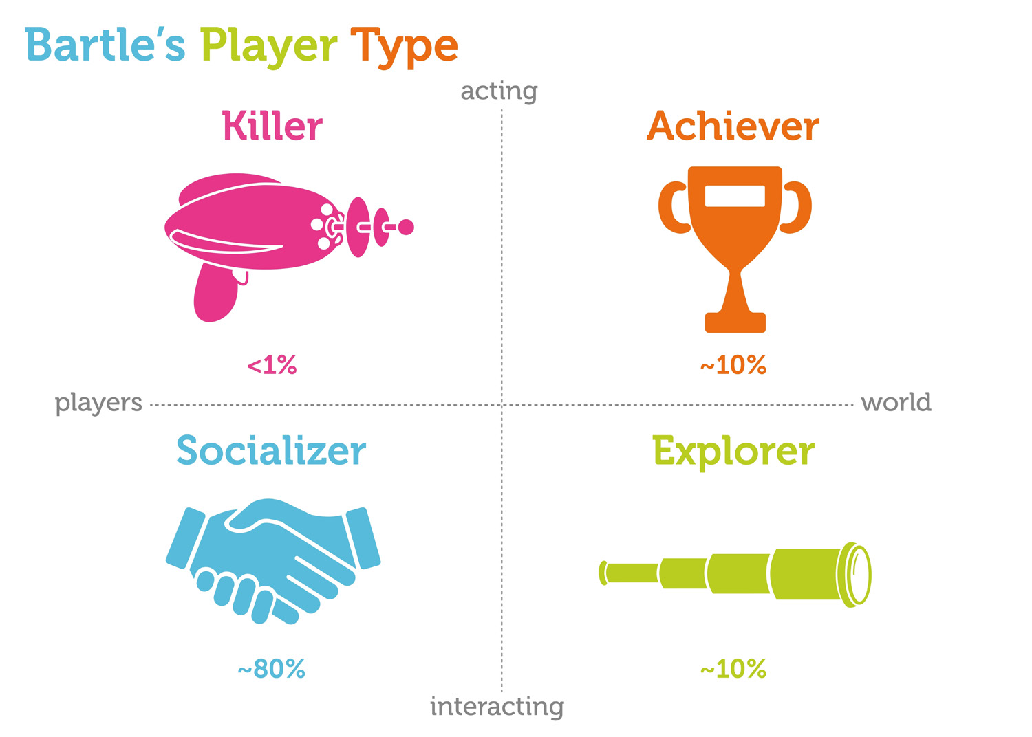 またプレイヤーペルソナには、「Bartleのプレイヤータイプ」を含めることもできます。Bartleのプレイヤータイプとは、あらゆる種類のゲームにおいてプレイヤーがモチベーションを高める要因を理解する手助けになる評価尺度です。この情報は、仕事を取り巻く文化についての理解を支えるものでもあります。