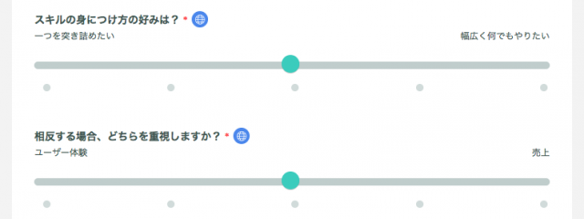 転職希望に関する情報を登録していくと、自分自身のキャラクターについて入力する項目があります。ここでは、得意な事業フェーズや好きな社風、仕事のスタイルを5段階から選ぶことができます。会社のカルチャーとのミスマッチを減らせそうだなと思いました。