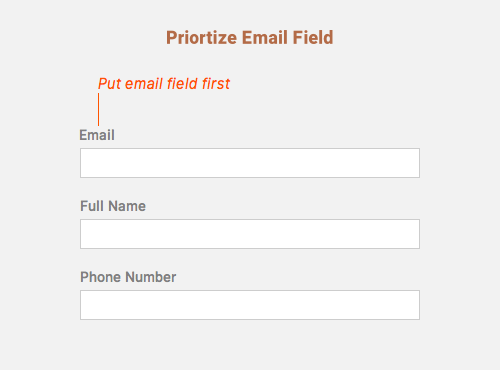 メールアドレスフィールドを最初に配置することで、入力ミスを防ぐことができます。これは、メールアドレスフィールドがフォームの最初にあるので、ユーザーは急ぐ必要がないと感じるからです。メールアドレスフィールドをフォームの真ん中や最後に配置することは、理想的ではありません。なぜならユーザーは入力に疲れてきていて、早く終わりにしたいと思っているからです。