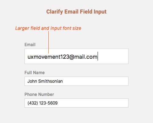 多くのフォームにおいて、メールアドレスフィールドの入力に使用するフォントサイズが小さすぎます。ユーザーが入力ミスをした場合、それに気付くのは難しいでしょう。入力フィールドのフォントサイズが大きければ、ユーザーは特定の文字を簡単に識別できます。フォントサイズを大きくすることは、ユーザーが入力内容を確認するとき、ひと目で入力ミスに気づくのに役立つでしょう。