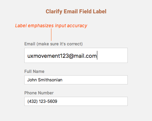 ほとんどのデザイナーは、メールアドレスフィールドに「メールアドレス」というラベルを付けます。これは短くてわかりやすいですが、入力精度の重要性は強調していません。ユーザーに入力データを再確認してほしい場合は、入力フィールドのラベルで強調する必要があります。